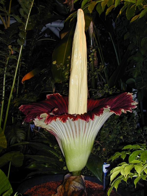 1. Самый крупный цветок в мире - аморфофаллус титанум (Amorphophallus titanum) относится к семейству лилий. Он представляет собой огромные рассеченные посередине листья, из которых выходит высокий желтый початок. Из-за отвратительного запаха, напоминающего тухлое мясо, местные жители называют его «трупный цветок». Живет это растение до 40 лет, при этом цветет всего несколько раз. Само цветение длится всего 2-3 дня. Кстати, в переводе название цветка означает Большой Деформированный Пенис, взглянув на фотографию, становится понятно - название прямо в точку!